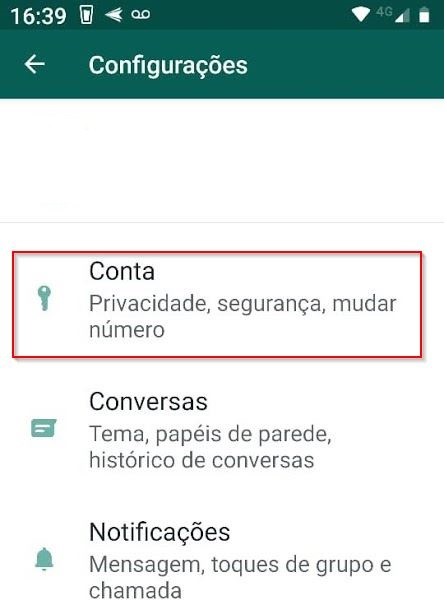 Clique no menu de três pontos, no canto superior direito da tela, e então clique em “Configurações.” Na tela de configurações, clique em “Conta”: