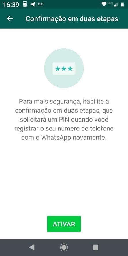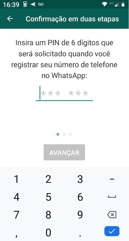 Já expliquei em outro artigo sobre a importância da confirmação em duas etapas, também conhecida como autenticação em dois fatores. No WhatsApp, ela funciona de maneira parecida: ao registrar seu aparelho, além do código de informação enviado por SMS, você precisará informar um PIN que seis dígitos que você mesmo define.