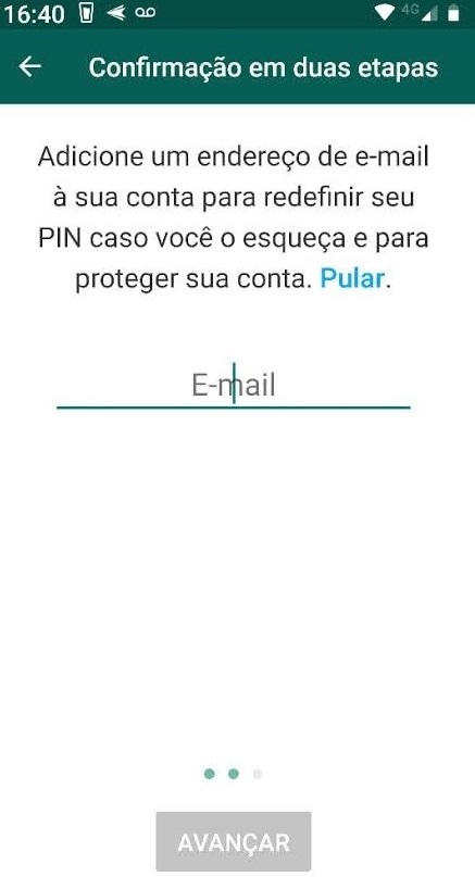 Digite o PIN e clique em avançar. O aplicativo pedirá para você digitar o PIN mais uma vez. Digite novamente e clique em “avançar.” Na próxima tela, o aplicativo pede um endereço de e-mail:
