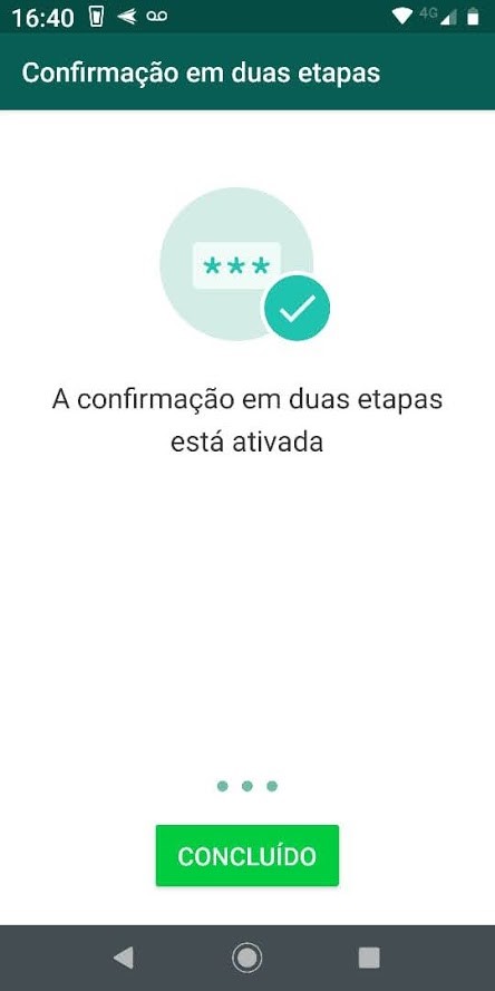 Agora sua conta está protegida pela confirmação em duas etapas. Quando você—ou outra pessoa—tentar ativar o seu WhatsApp em qualquer aparelho, precisará digitar o PIN. Nem é preciso dizer que você não deve divulgar seu PIN para terceiros, em hipótese alguma.