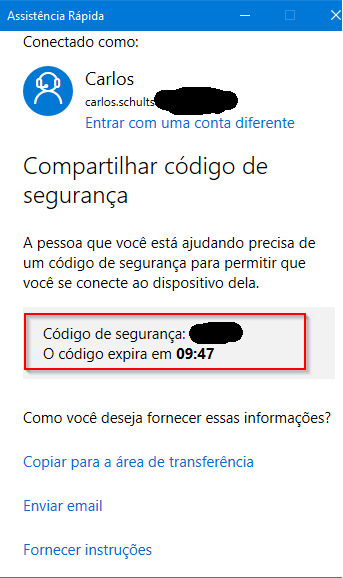 Após fazer o login e avançar, você verá uma tela exibindo o código de segurança, além de várias opções que você pode usar para compartilhar o código com a pessoa que você está ajudando: