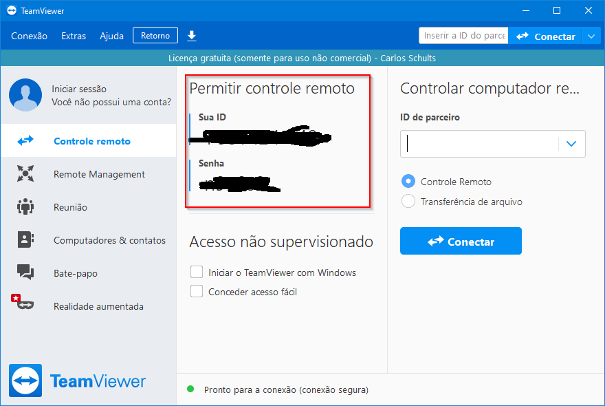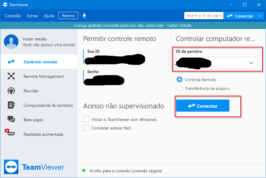 Daí em diante, basta informar a senha que a pessoa lhe passou, e a conexão vai acontecer. É importante salientar que o uso do TeamViewer é gratuito para uso pessoal. Porém, se você está uma empresa ou escritório, é preciso adquirir uma licença.