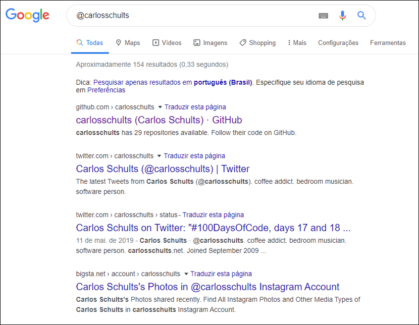 Você também pode usar o Google para buscar certos tipos de informação em redes sociais. Por exemplo, se você souber um nome de usuário, você consegue facilmente ter acesso a perfis com aquele nome: