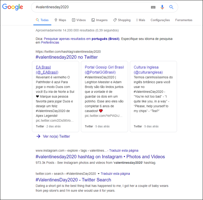 Pesquisar por hashtags também traz resultados das principais redes sociais: