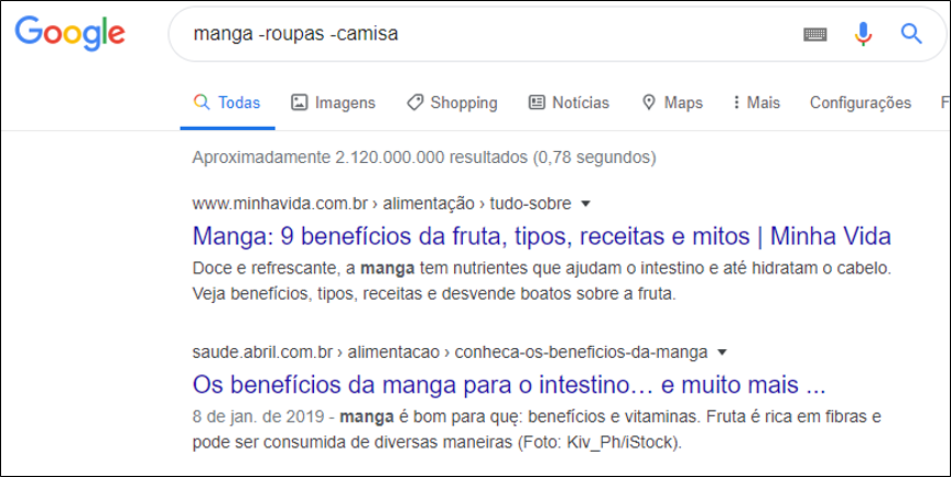Às vezes é útil excluir uma palavra da sua busca. Por exemplo, digamos que você queira pesquisar sobre a fruta manga, mas não quer nenhum resultado referente à parte das camisas também chamada de manga. Nesse caso, é possível excluir quaisquer palavras indesejadas dos resultados usando o hífen (-).
