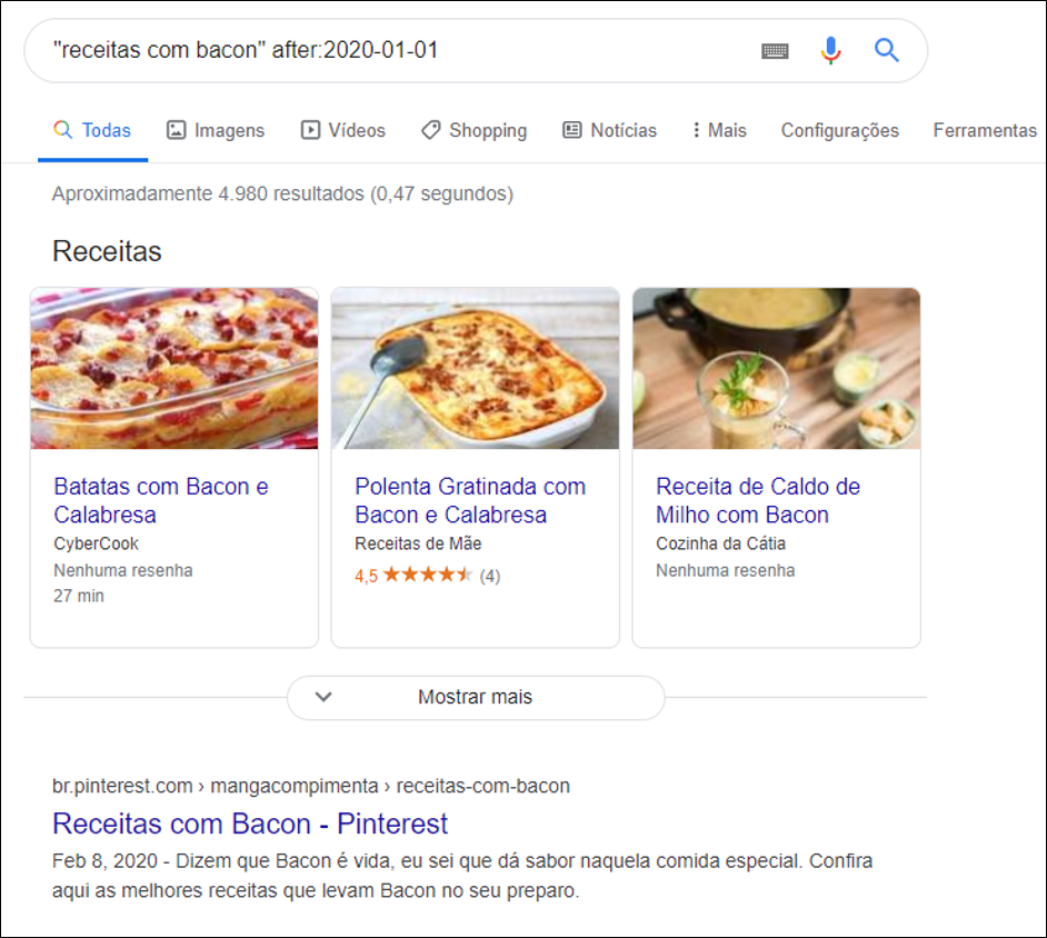 O Google permite filtrar os resultados da pesquisa por datas específicas. Por exemplo, digamos que você quer buscar por receitas com bacon. Porém, você quer receitas novas, que foram publicadas esse ano. Você pode fazer isso usando o parâmetro after, seguido pela data, em formato YYYY-MM-DD. Exemplo: