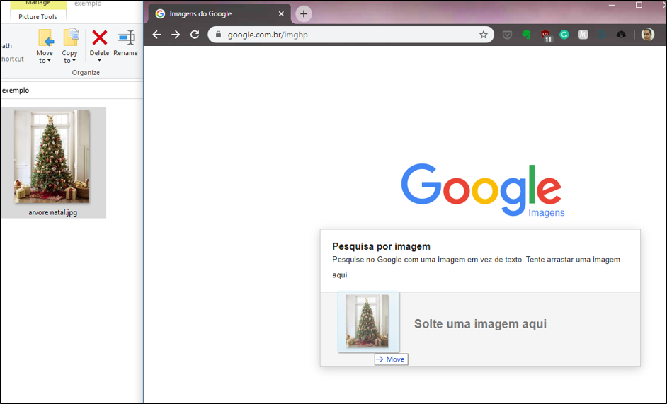 Existe ainda uma terceira opção, mais fácil, e o próprio Google já nos deu a dica. Podemos simplesmente arrastar uma imagem diretamente do computador para esta janela, conforme o exemplo abaixo: