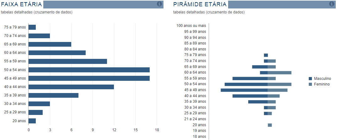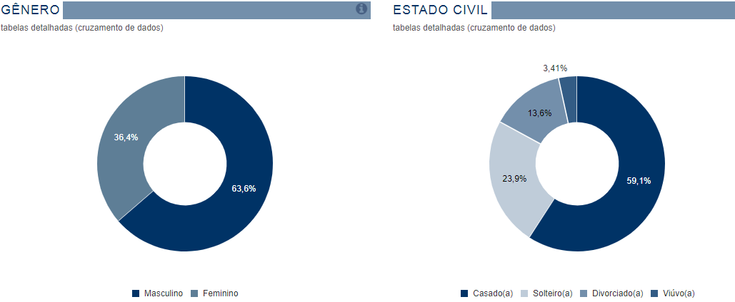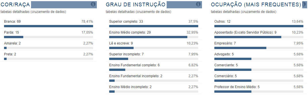 Em relação a cor/raça, 78,41% se declararam brancas, 17,5% pardas, 2,27% amarelas e 2,27% negras. Já em relação à escolaridade, 37,5% têm nível superior e 10,23% declararam que leem e escrevem. Veja mais detalhes: