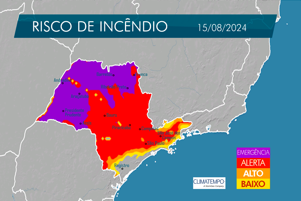 O estado de São Paulo segue com diversas regiões em estado de emergência para incêndios florestais, segundo a Defesa Civil Estadual. O Mapa de Risco de Incêndio é uma das ferramentas tecnológicas que auxiliam o órgão no monitoramento de queimadas em vegetação durante o período da estiagem.
