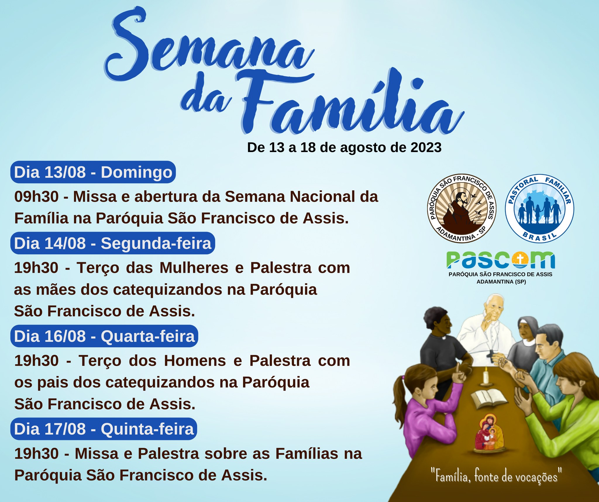 Em Adamantina a Semana da Família é celebrada nas três paróquias: Santo Antônio, Nossa Senhora de Fátima e São Francisco de Assis. Veja a programação de cada uma das três comunidades: