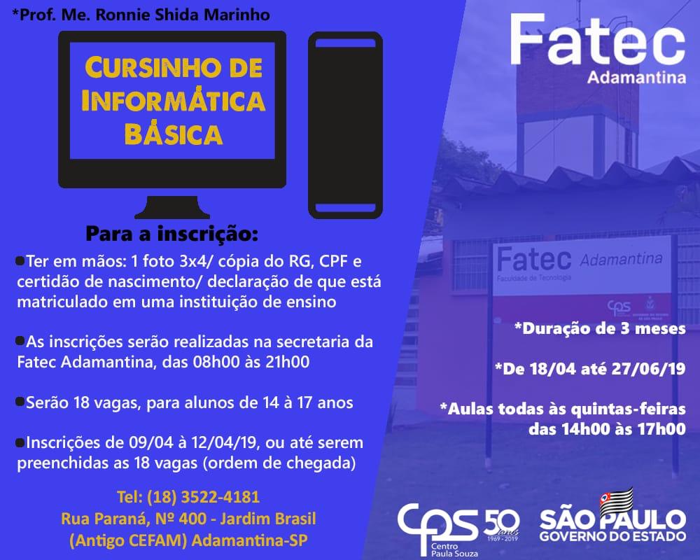 A Fatec Adamantina abre nesta terça-feira (9) as inscrições para cursinho de informática básica. Interessados devem procurar a unidade até sexta-feira (12). São oferecidas 18 vagas, que serão preenchidas por ordem de chegada.