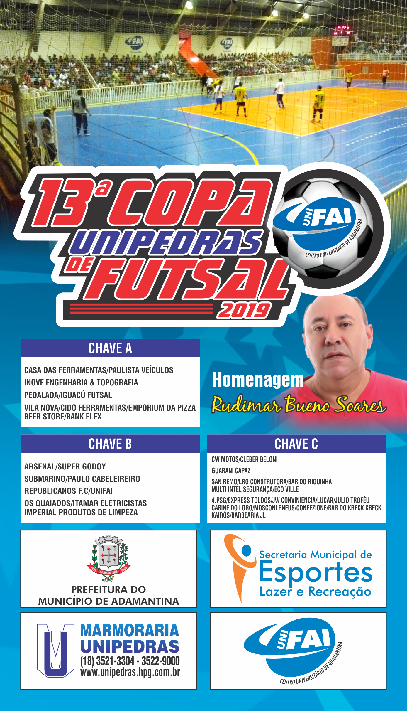 A 13ª Copa Unipedras de Futsal começa segunda-feira (11), com a realização de três jogos a partir das 19h30 no Ginásio de Esportes “Paulo Camargo”. As disputas ocorrem as segundas, quartas e sextas-feiras. A competição contará com participação de 12 equipes com jogadores de Adamantina e região.