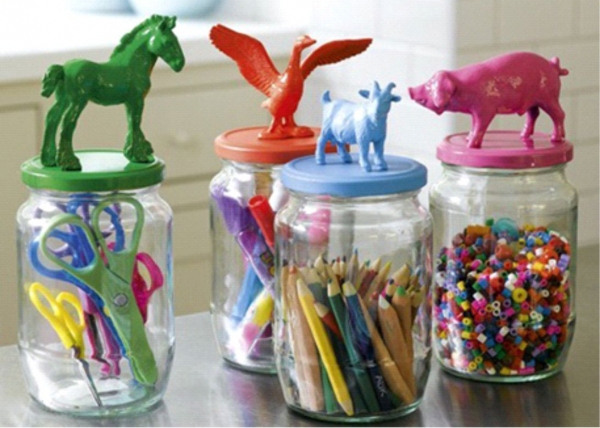 Além de porta-vela eles podem organizar os itens da criançada. Para este projeto você precisará de tinta spray, cola quente e aqueles bichinhos comprados num saquinho. Cola o bichinho na tampa, espere secar e passe tinta spray. Está pronto!