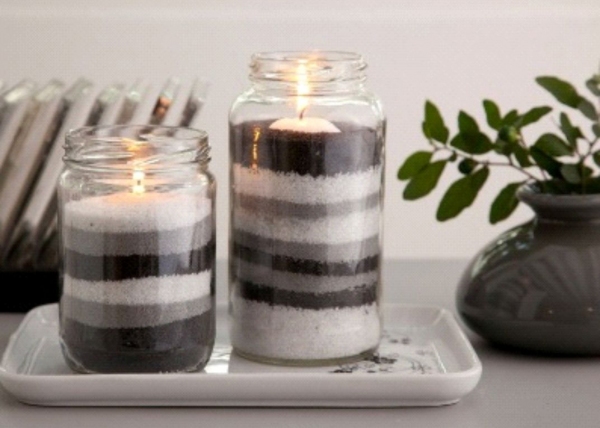 E aqueles vidros que geralmente jogamos fora? Eles viram porta-vela. Você pode colocar sal grosso, areia ou pedrinhas. Olha que graça! Espero que tenham gostado! Até a próxima sexta!