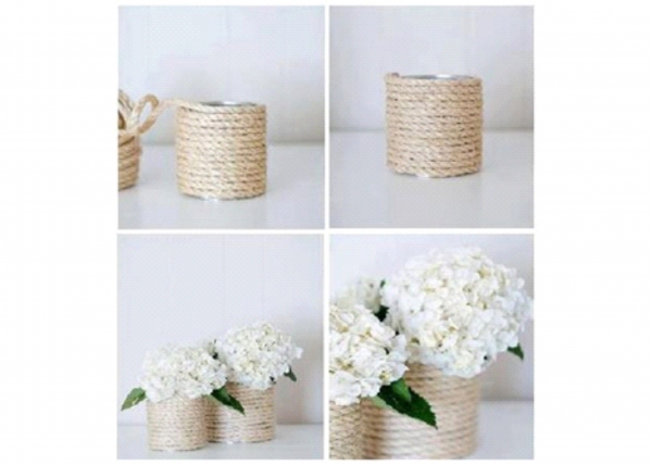 Para o vasinho de corda você precisará de latinhas, corda e cola quente. A espessura da corda varia como tamanho da lata. Basta encapar e colar em pelo menos 3 pontos para que ela não solte.