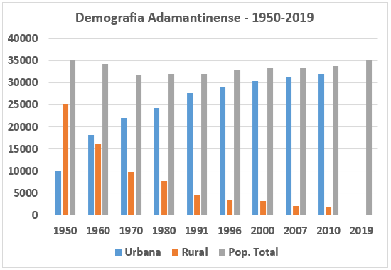 Diante disso, dando uma revisitada em alguns textos já escritos por aqui e ali, acabei encontrando um deles, publicado em 06/01/2020, onde comentei sobre como a população adamantinense havia “evoluído ou involuído” em termos populacionais nas áreas urbana e rural, bem como ao longo dos anos (veja aqui).