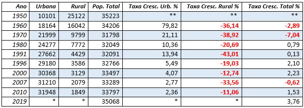 ** Dados de 1940 não disponíveis em virtude da criação do município em 1949