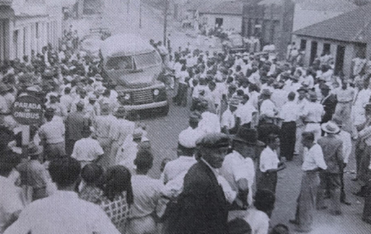 1950: chegada do primeiro ônibus da linha Adamantina/Lucélia(Reprodução: Livro Reviver Adamantina/João Caarlos Rodrigues).