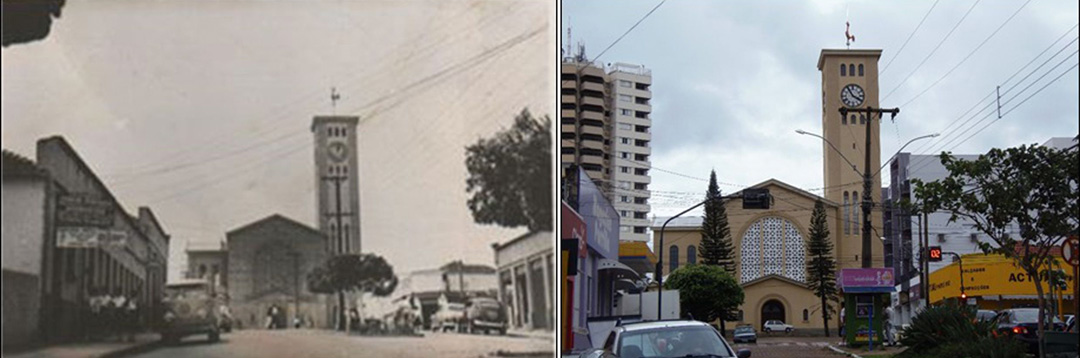 Pois bem, o nosso ponto de partida foi a Igreja Matriz de Santo Antônio, onde pudemos compará-la a partir de dois ângulos diferentes, sendo perceptível a inexistência do Edíficio San Patrick nas fotos mais antigas.