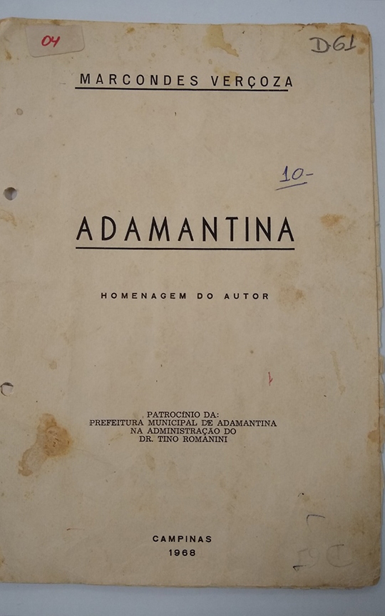 Dias atrás, em um de minhas idas e vinda à Biblioteca Pública Municipal, acabei digitalizando um material bem interessante sobre a história da terrinha. Tratava-se de uma espécie de revista, onde havia uma poesia composta pelo Sr. Marcondes Verçoza, com o nome de “Adamantina – Homenagem do Autor”. A obra fora produzida em 1967, com patrocínio da Prefeitura Municipal, na Gestão do Sr. Gumercindo Romanini (Tino).