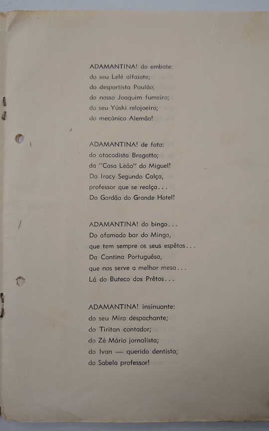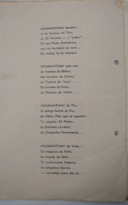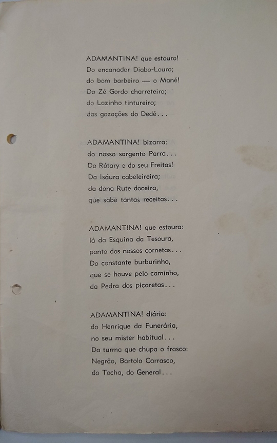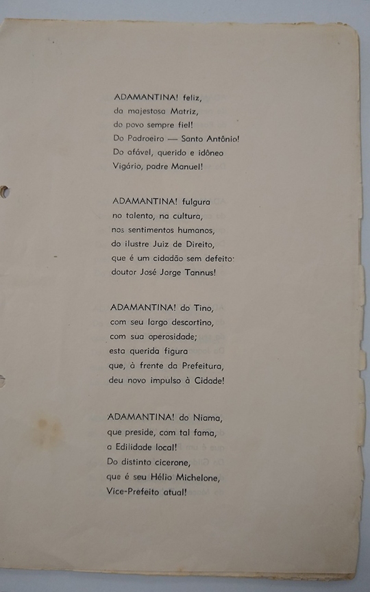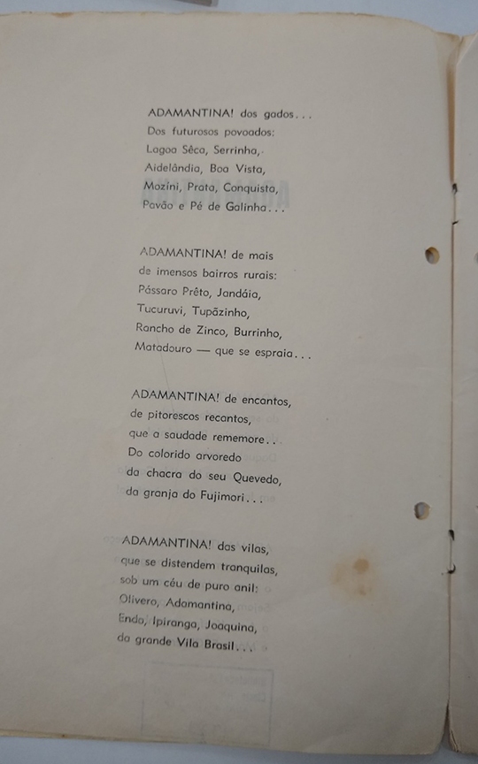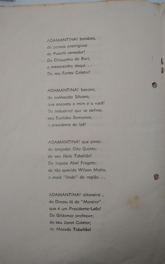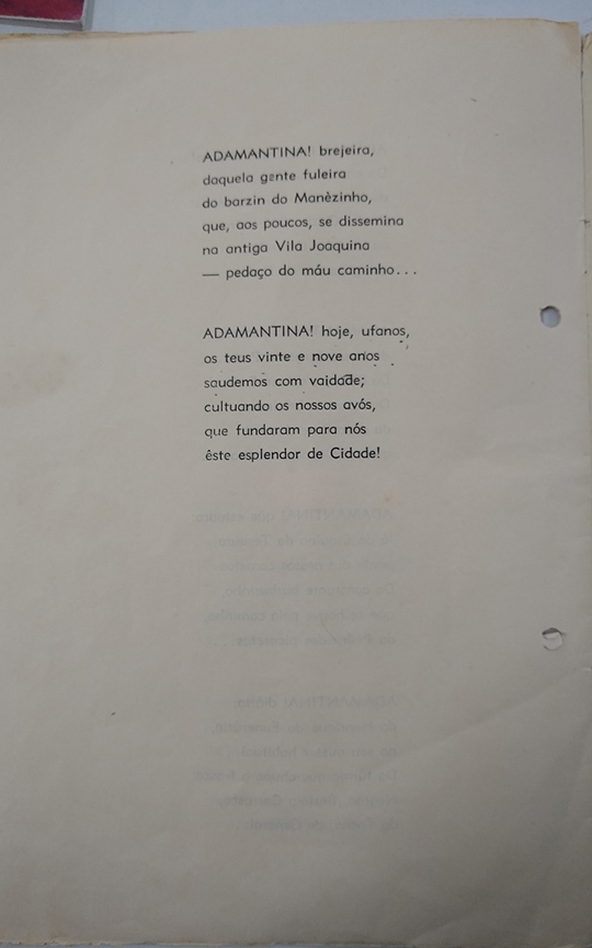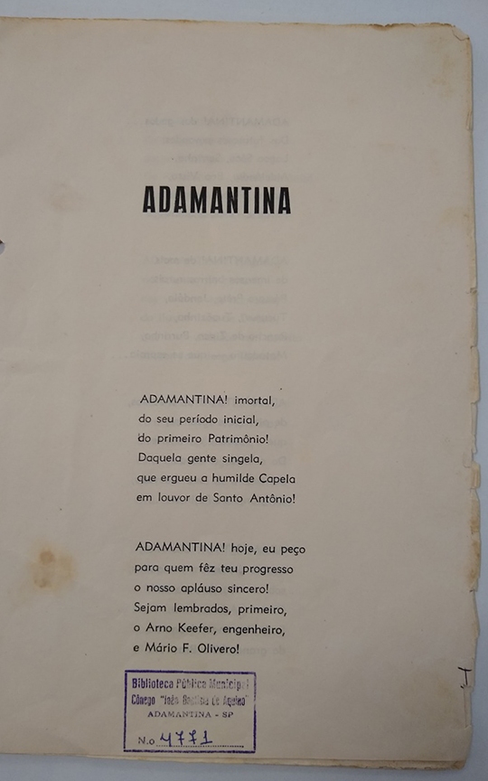 Para os que estão curiosos, a referida poesia é composta de versos que narram personagens, lugares, momentos e sentimentos sobre a cidade de Adamantina naquele período. Traz um forte apelo ao lado “bandeirante e pioneiro” das primeiras pessoas que por aqui chegaram, aos comerciantes, bairros, políticos, lideranças, etc. Realmente, vale a pena conferir tais versos.
