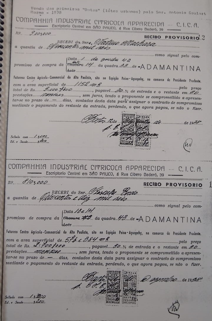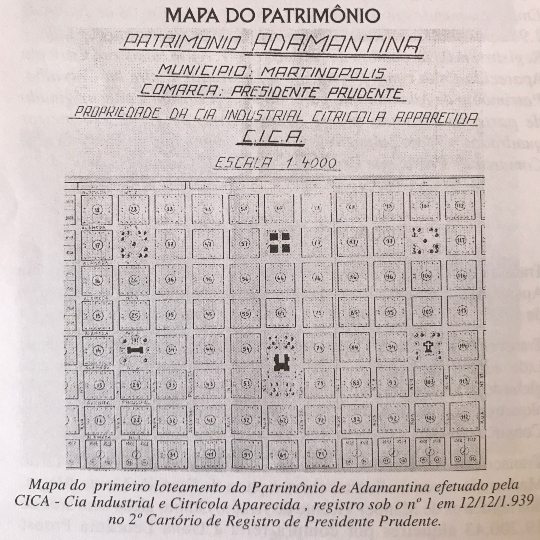 - Em 12 de dezembro de 1939, temos o registro do “Primeiro mapa do loteamento do Patrimônio Adamantina, Município de Martinópolis, efetuado pela CICA. (Registro nº 1 de 12/12/1939 no 2º Cartório de Registro de Presidente Prudente)