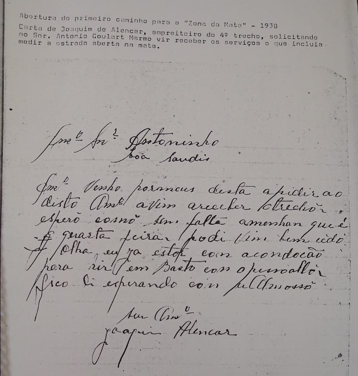 - Em 1938, vários trechos começaram a ser abertos na região, dentre os empreiteiros, destacaram-se: José Alexandrino, Mitre Fiuza Aires, Vigílio Pereira Alves, Joaquim de Alencar, Raimundo Dias do Nascimento e João Arruda.