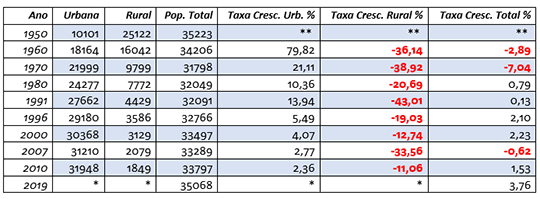 Segundo dados do Instituto Brasileiro de Geografia e Estatística (IBGE), responsável pelos Censos, a população da ‘terrinha’ sempre oscilou entre a casa dos 30 mil habitantes (Vide Tabela e Gráficos). Para se ter uma ideia de como nos urbanizamos a população urbana daqui em 1950 girava na casa dos 29%, enquanto que a população rural se concentrava nos 71% restantes, atualmente, segundo o Censo de 2010, 95% da população reside na área urbana, enquanto que os outros 5% reside em áreas rurais.