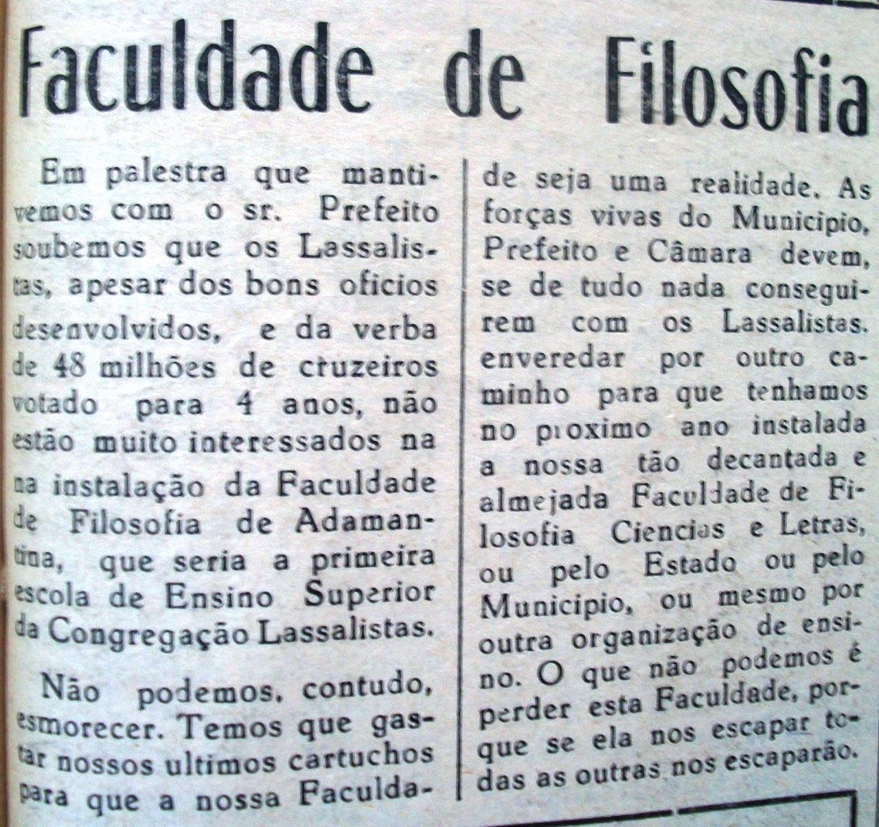 Em palestra que mantivemos com o Sr. Prefeito, soubemos que os Lassalistas, apesar dos bons ofícios desenvolvidos, e da verba de 48 milhões de cruzeiros, votados para 4 anos, não estão muito interessados na instalação da Faculdade de Filosofia de Adamantina, que seria a primeira escola de Ensino Superior da Congregação Lassalistas. [...] Não podemos contudo esmorecer. Temos que gastar nossos últimos cartuchos para que a nossa faculdade seja uma realidade. As forças vivas do município, Prefeito e Câmara se de tudo, nada conseguirem com os Lassalistas, enveredar por outro caminho, para que tenhamos no próximo ano instalada, a nossa tão decantada e almejada Faculdade de Filosofia Ciências e Letras, ou pelo Estado ou pelo Município ou mesmo por outra organização de ensino. O que não podemos é perder a faculdade, por que se ela nos escapar, todas as outras nos escaparão. (Faculdade de Filosofia. Jornal O Adamantinense nº 3, ano I, p. 1, 30/1/1966)