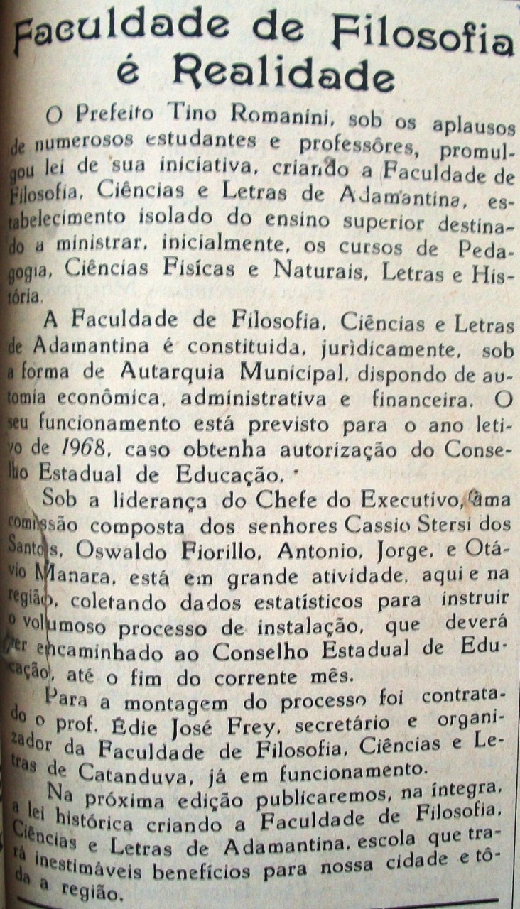 Faculdade de Filosofia é realidade. Jornal O Adamantinense nº 78, ano II, p. 1, 2/7/1967.