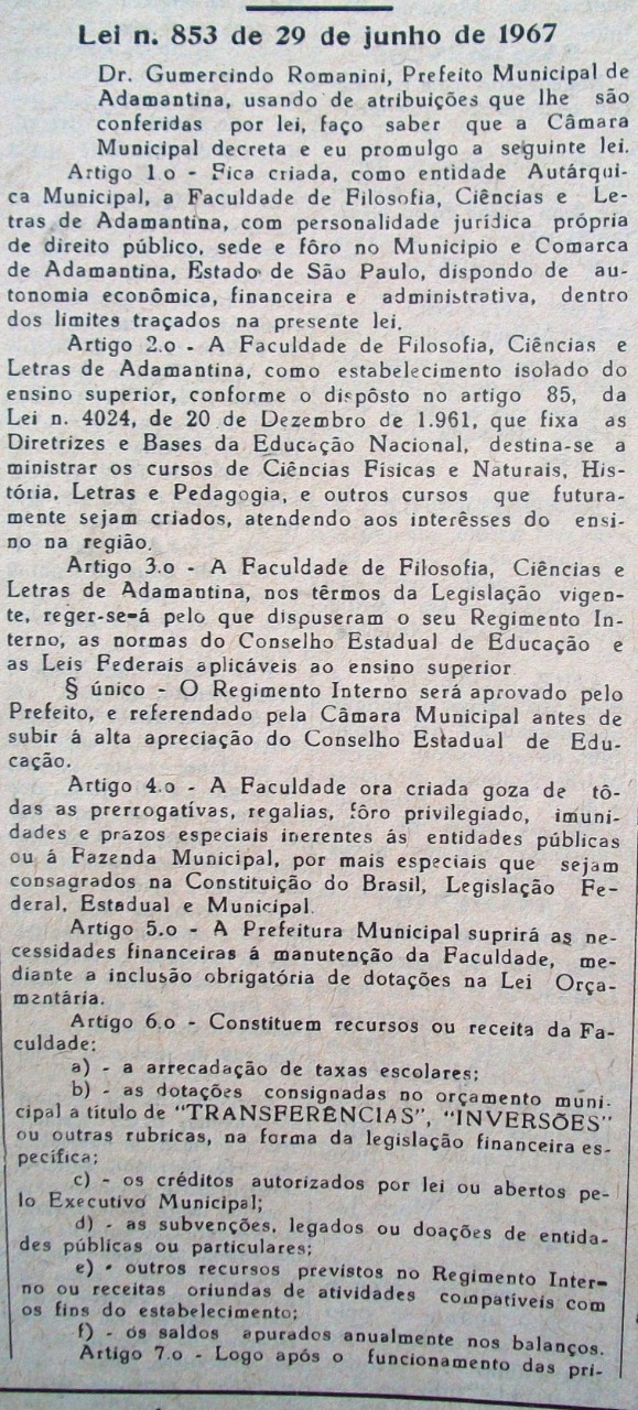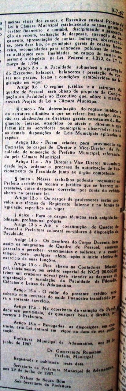 Publicação da lei que cria a FAFIA. Jornal O Adamantinense nº 79, ano II, p. 4, 9/7/1967 (Parte 1).