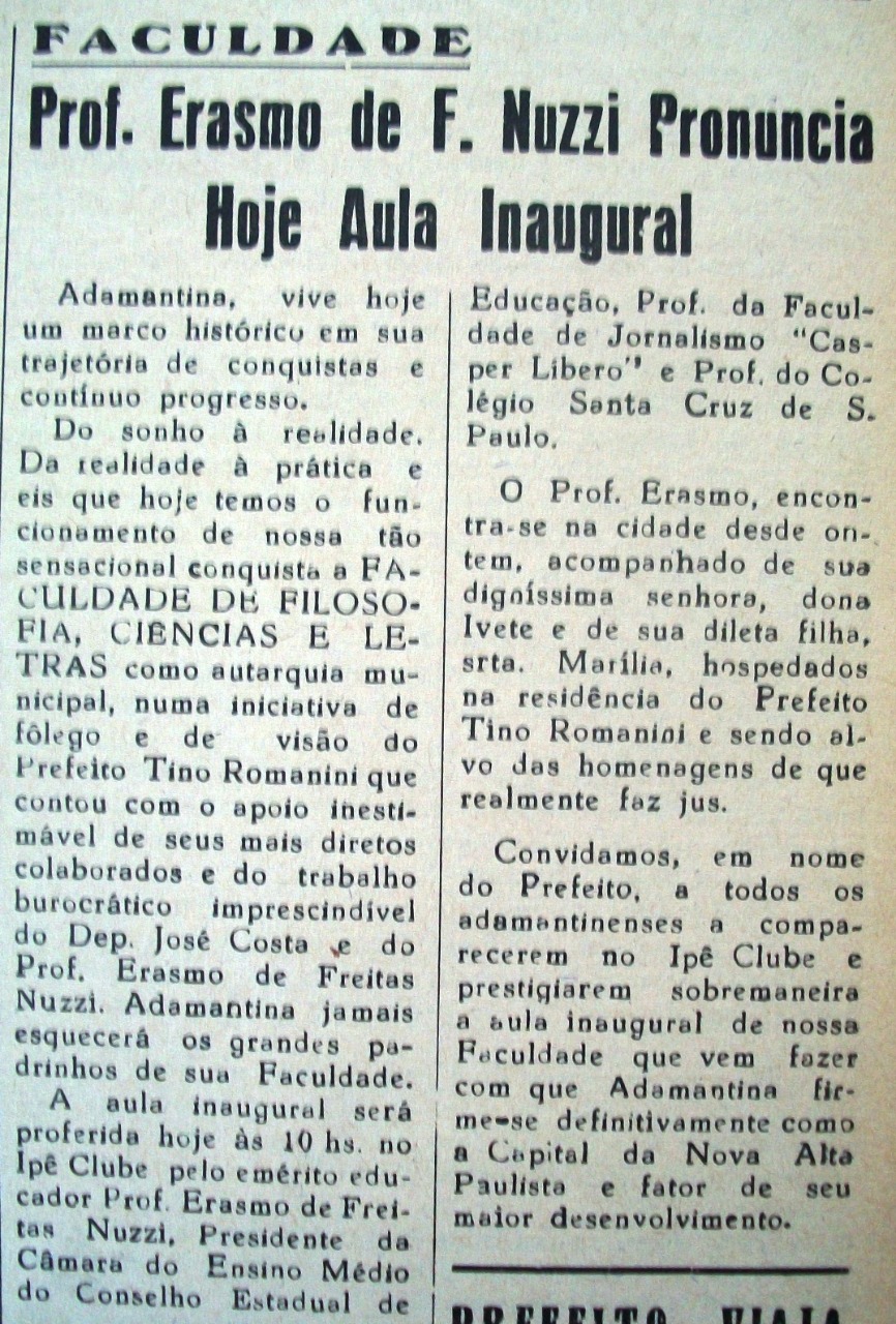 Adamantina vive hoje um marco histórico em sua trajetória de conquistas e contínuo progresso. Do sonho à realidade. Da realidade à prática e eis que hoje temos o funcionamento de nossa tão sensacional conquista, a FACULDADE DE FILOSOFIA CIÊNCIAS E LETRAS, como autarquia municipal. Numa iniciativa de fôlego e de visão do Prefeito Gumercindo Romanini que contou com o apoio de seus mais diretos colaboradores. [...] Convidamos, em nome do Prefeito, a todos os adamantinenses a comparecerem no Ipê Clube e prestigiarem sobremaneira a aula inaugural de nossa Faculdade, que vem fazer com que Adamantina firme-se definitivamente como a “Capital da Nova Alta Paulista” e fator de seu maior desenvolvimento. (grifo nosso) (Prof. Erasmo de F. Nuzzi pronuncia hoje aula inaugural. Jornal O Adamantinense nº135, ano III, p. 1, 4/8/1968)