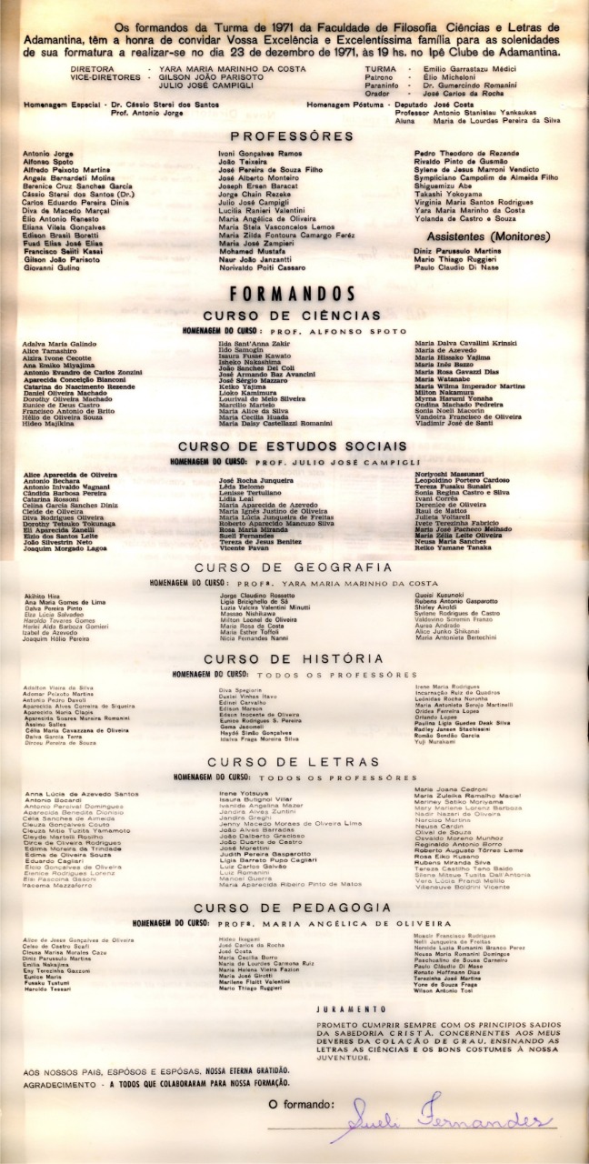 Convite de Formatura – Paraninfo: Tino. Primeiro convite de formatura da FAFIA (Arquivo pessoal da Sra. Sueli Fernandes).