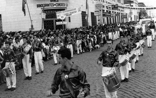 E em meio a tal situação de retorno, eu separava algumas imagens para os primeiros dias de aula, acabei me deparando com algumas fotos de desfiles da terrinha nas décadas de 1950 e 1960. As escolas tanto públicas como particulares realizavam atividades “grandiosas”, com suas bandas e/ou fanfarras por aqui.