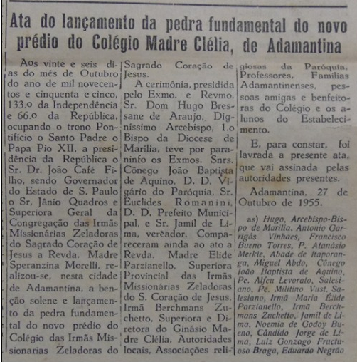 Cópia da ata de lançamento da pedra fundamental do novo prédio do Colégio Madre Clélia (Reprodução/Jornal A Comarca de Adamantina).