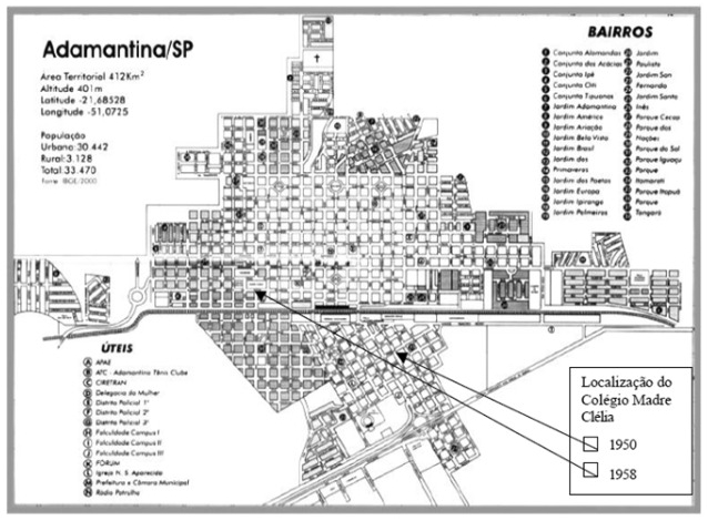 O Senhor Jamil de Lima tinha uma filha na Congregação, Ir. Maristela, falecida em 13/7/1966. Ele doou para a entidade um terreno na entrada de Adamantina, cidade nova e promissora, localizada na alta paulista. Em 30 de março de 1950 foi lançada a pedra fundamental do prédio, cujo objetivo inicial seria o funcionamento do Orfanato Madre Clélia. (grifo nosso) (2000, p. 115)