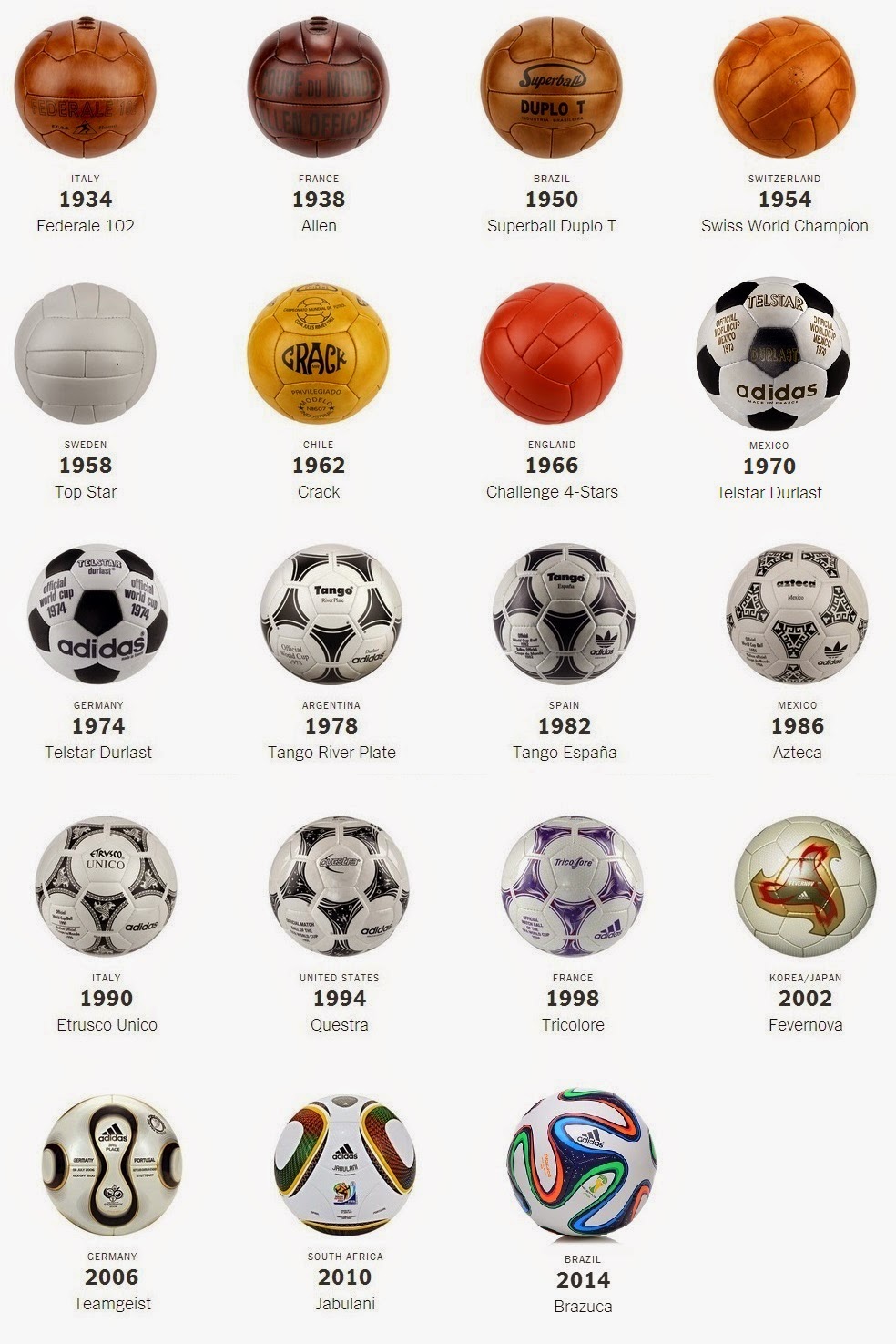 Além das mascotes, outro ponto que também merece destaque, se dá com relação as bolas oficiais, que também acabam representando traços da cultura do país sede, cada qual com seu design e traços específicos. Quem não se lembra da famosa “Jabulani”? Que segundo os jogadores, “parecia ter vida própria”. Mas, e as outras bolas? Também possuíam nomes específicos? Sim, e cada qual com as suas particularidades, a saber: