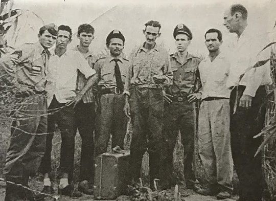 Sargento Parra (esquerda) e delegado Milton Gonzales (direita) e ao centro o criminso ladeado por dois pliciais miliates, por ocasião da reconsittuição não oficial do crime (Reprodução/Jubileu de Ouro Adamantina/Cândido Jorge de Lima).