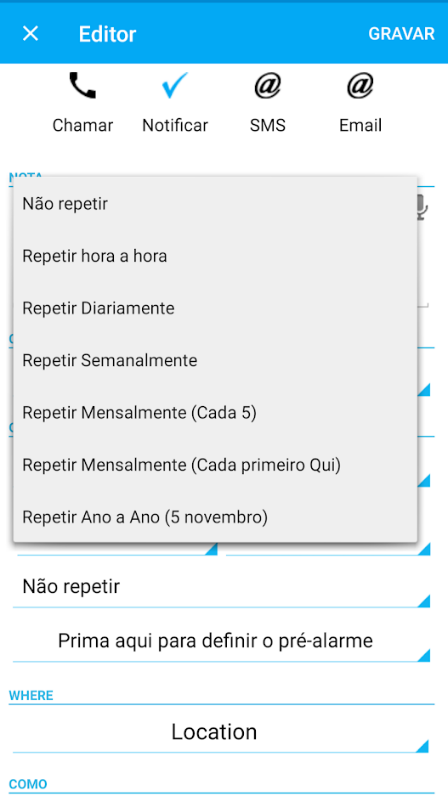 O Life Reminders permite configurar lembretes por data específica, tempo (daqui a 20 minutos, daqui a 40 minutos), e também por localização. Você pode adicionar lembretes que vão executar uma vez só, bem como configurar lembretes para repetirem de acordo com o intervalo desejado.