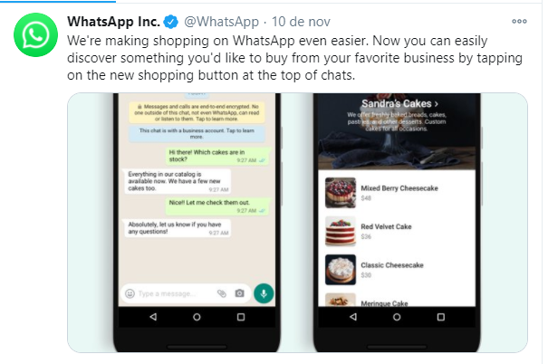 O twitter oficial em inglês do WhatsApp publicou antes de ontem, dia 10, um post no qual revela que os usuários do WhatsApp agora contam com o botão shopping, que permite acessar o catálogo de produtos oferecidos pelas empresas.