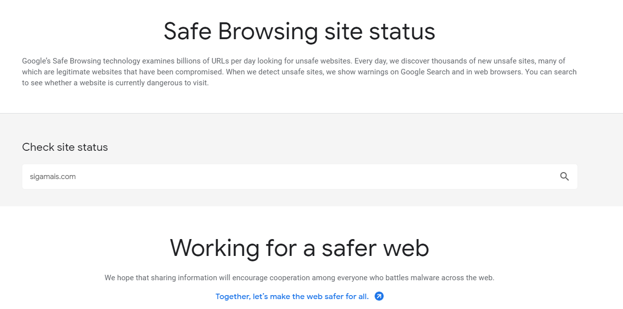 O Google disponibiliza uma ferramenta que permite a verificação de URLs. Dessa forma, você pode buscar qualquer site e descobrir, em segundos, se existe algum incidente de segurança relacionado a ele.