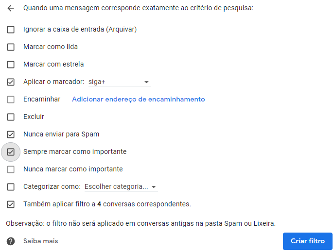 • Nunca enviar para spam. Estou instruindo o Gmail a jamais enviar para o spam (lixo eletrônico) as mensagens que casam com os critérios de busca definidos.