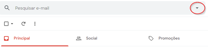 Filtros no Gmail são criados a partir de buscas. Para começar, na página inicial do Gmail, clique no ícone de seta no campo de busca, como a imagem a seguir mostra: