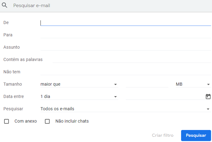 Para continuar com a criação do filtro, basta clicar em “Pesquisa avançada” ou na seta à direita do campo de busca. A tela com as opções de pesquisa será exibida novamente. Agora, devemos clicar em “Criar filtro.”