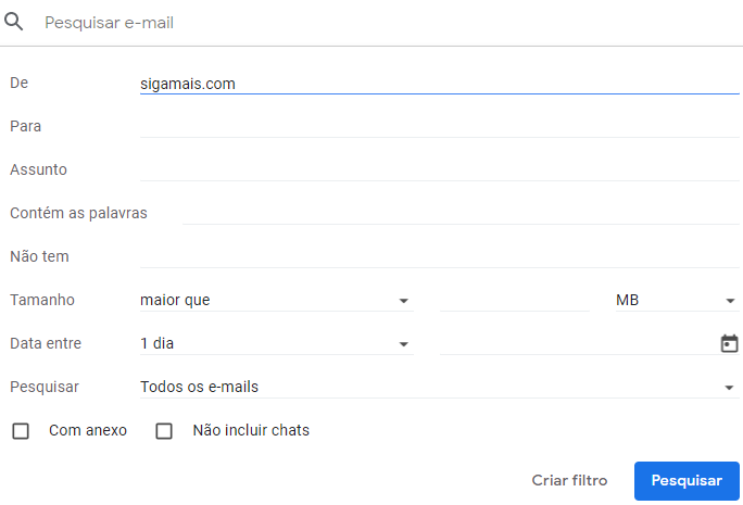 Preencher as opções desta tela e clicar no botão “Pesquisar” equivale a usar os operadores de busca mencionados no artigo passado. Para criar o filtro neste exemplo, vou preencher o campo “De”, que equivale a usar o operador de busca from. Eu poderia continuar a usar o exemplo do domínio organizacoesacme.com.br, porém não haveria nenhum resultado, visto que esse site não existe (pelo menos até a data em que escrevo esse artigo.)