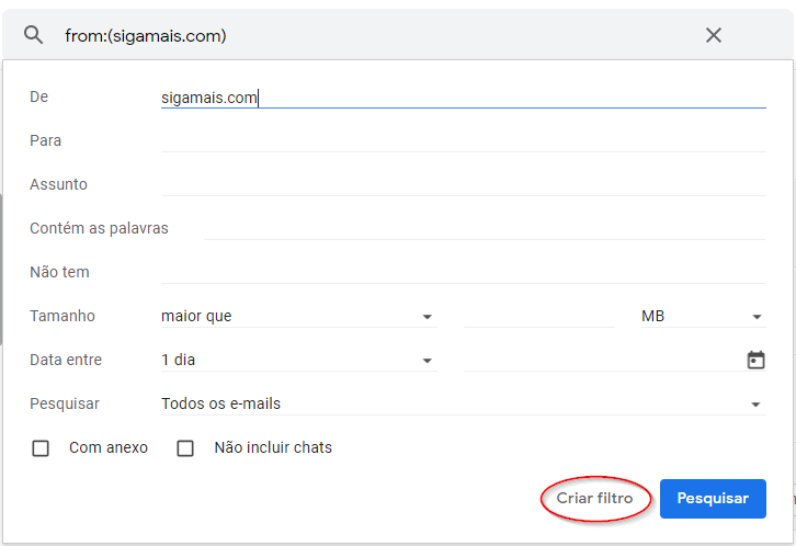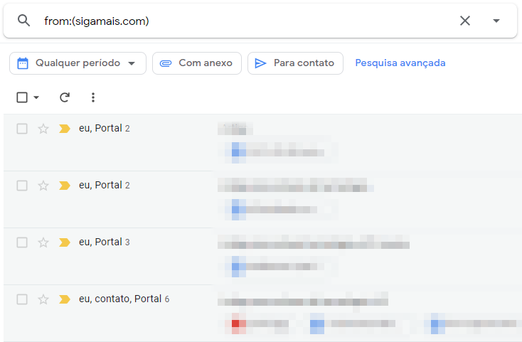 Como estou buscando diretamente pelo domínio, o Gmail vai mostrar resultados de quaisquer e-mails cujo domínio é sigamais.com. Em outras palavras: não importa o que vem antes do sinal de arroba (@); se o que vem depois é sigamais.com, vai aparecer no resultado.