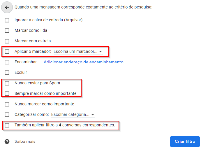 Como você pode ver, essas são apenas algumas das opções possíveis. Há várias outras, como encaminhar o e-mail para outro endereço, ignorar a caixa de entrada (arquivar o e-mail diretamente), entre outras.