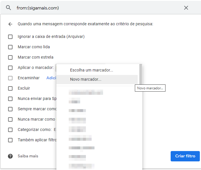 Agora vou mostrar como atribuir um marcador para as mensagens selecionadas pelo filtro. Mais especificamente, vou ensinar como criar um marcador, já que o marcador que quero selecionar ainda não existe.