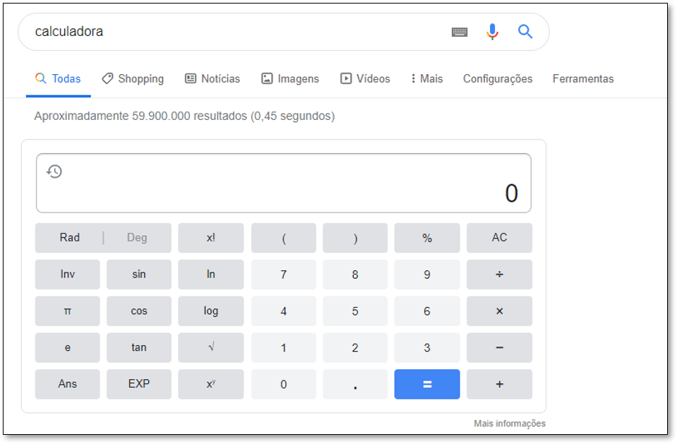Uma função extremamente útil do Google que você talvez não conheça é a de calculadora. Para acessá-la, apenas digite calculadora no buscador e pressione a tecla ENTER. Uma calculadora irá aparecer logo abaixo da barra de buscas: