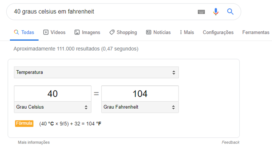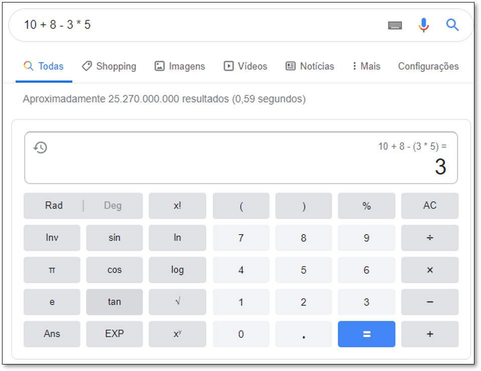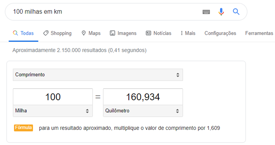 Como você pode ver, além de dar o resultado, o Google também explica como o resultado foi obtido, mostrando a fórmula usada.